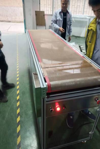 本次出貨的雙平臺全自動絲印機包括四個部分:上料結構區、CCD視覺對位區、全自動印刷區、制品搬送區另再配有連接隧道爐的自動流水線。